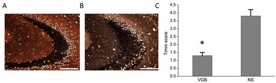 VGB-treated rats had less mossy fiber sprouting. Timm’s staining (A,B) showed significantly fewer mossy fibers sprouting in the hippocampal CA3 region of the VGB group (A) than in the NS group (B). The Timm’s score (C) for VGB vs. NS were significant, * p < 0.05) (N = 7 in each group). The scale bar = 200 μM.