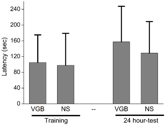 VGB-treated rats did not preserve inhibitory avoidance test performance. The duration of the hesitancy to enter the dark compartment during training and after training did not differ significantly between the VGB and NS groups (VGB vs. control, p = 0.18).