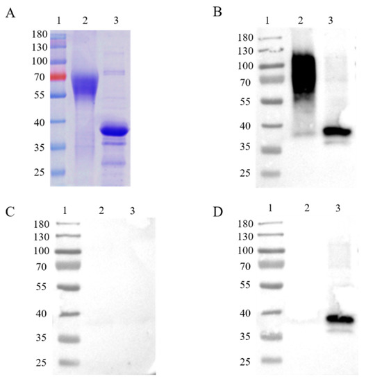 SDS-PAGE and western blot analysis of purified recombinant CD2v (63 kDa) and p30 (35 kDa) proteins (A). Analysis of immunogenic identification of p30 and CD2v proteins by western blot assay (B–D). Recombinant CD2v and p30 proteins could react with ASFV-positive sera (B), but not-negative sera (C). The recombinant p30 protein could react with ASFV-ΔCD2v-infected sera, in contrast to the CD2v protein (D). Lane 1: protein marker; Lane 2: CD2v; Lane 3: p30.