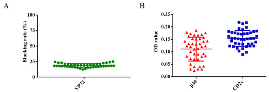 A total of 43 swine serum samples were used to determine the cut-off value of the ELISA. Firstly, these serum samples were detected using the OIE-recommended INgezim ASFV antibody blocking ELISA kit according to the manufacturer’s instructions, which yielded negative results (Figure 3A). These 43 samples were also measured using the newly established dual ELISA for CD2v and p30, showing results consistent with those of the INgezim ELISA kit. The average OD value of these serum samples was 0.16 using the ELISA for CD2v and 0.11 using the ELISA for p30 (Figure 3B). Two times of the average OD value was set as cut-off value according to previously established researches [13,14,15]. Therefore, OD values of 0.32 and 0.22 were established as the cut-off for the CD2v and p30 ELISA, respectively.