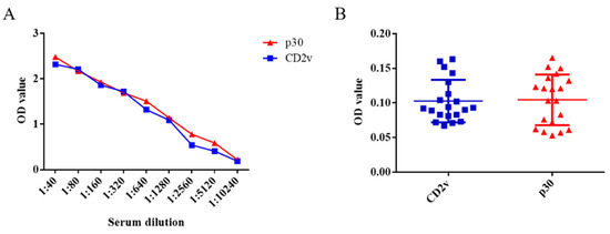 Detection sensitivity and specificity of the ELISA kits based on the CD2v or p30 proteins for ASFV. Ten ASFV-infected serum samples were subject to a series of dilutions. According to the cut-off value, the positivity of these serum samples could be detected up to a dilution of 5120 times (A). The two ELISA kits based on CD2v or p30 proteins did not react with 1:40 diluent CSFV-, PRRSV-, JEV-, PRV-, and PPV-infected serum samples, highlighting their specificity (B). Data are shown as the mean ± SD. Blue lines with squares indicate CD2v, whereas red lines with triangles indicate p30.