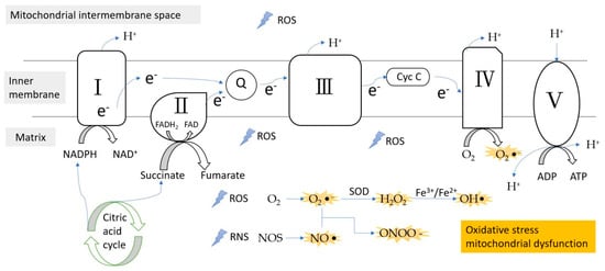 Mitochondria are important for energy metabolism [21]. The mitochondrial respiratory chain, which takes place in the inner mitochondrial membrane, is vital for energy metabolism. It is made of five compounds (complex I, II, III, IV, and V) [22], which catalyze the phosphorylation of ADP to ATP by electron transfer between them [23]. In 1956, Denham Harman first mentioned that free radicals, as by-products of the normal metabolism of mitochondria, attack cell constituents [24]. The following studies also suggest that intracellular ROS production is caused by the mitochondria. The production of mitochondrial superoxide radicals occurs primarily at complex I (NADH) and complex III (ubiquinone-cytochrome c reductase) [25]. In complex I, the electron transport chain of NADH and FADH2 transfers electrons to oxygen and hydrogen, and ROS or RNS production might occur during these electron transport steps. Under the general metabolic status, complex III is the main place of ROS production [26].