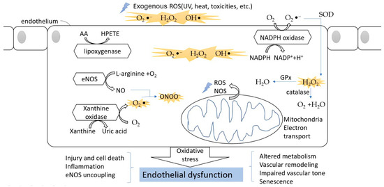 The oxidative stress in endothelial cells. The ROS can divide between an exogenous source and internal source. In the endothelium, during the processes of NO formation, uric acid generation, AA metabolism, and NADPH oxidation, ROS are released into the cytoplasm. The oxidative stress finally leads to endothelial dysfunction and affects normal physical function.