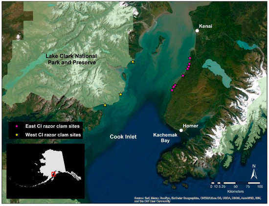 - Kerkvliet, C.M.; Booz, M.D. Cook Inlet Razor Clam Study, 2014; Regional Operational Plan ROP.SF.2A.2014; Alaska Department of Fish and Game: Anchorage, AK, USA, 2015.