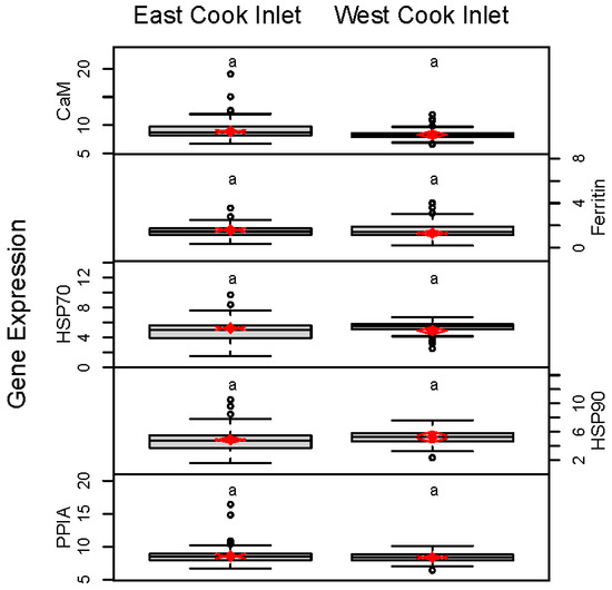 The stability of both reference genes was evaluated and ranked using the web-based analysis tool RefFinder (https://www.heartcure.com.au/reffinder/; accessed on October–December 2020) [57]. The more stable reference gene was selected for use in normalization of the five genes of interest. We used generalized linear mixed models (GLMM) within the LMER4 package in R version 3.6.1 to test for differences between areas and among sites on the east and west sides of Cook Inlet. The random effect included a site by year interaction to account for site level and interannual variation. Models for each gene expression were fit separately, and we performed post hoc Tukey tests to assess the differences between the means. We also used GLMM to obtain gene expression values for each of the twelve sites, retaining only year as a random effect. We again performed post hoc Tukey tests to make inferences about site-level differences. We show these results using boxplots constructed in R. As neither age nor length affected expression levels in a previous study on razor clams in LACL utilizing the same genes, neither were included in these analyses [37]. We assessed relationships among gene expression levels using Pearson correlations (NCSS, Statistical and Power Analysis Software, Kaysville, UT, USA).