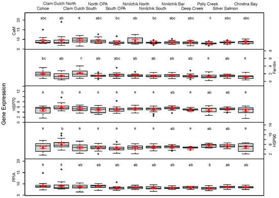 Site-level boxplots of data (CT values) from gene expression assays on five genes, performed on Pacific razor clams collected at nine sites in ECI (Cohoe–Deep Creek) and three sites in WCI (Polly Creek–Chinitna Bay). Random effects of model results are denoted by red diamonds (mean) and red arrows (95% confidence intervals). Sites sharing a letter did not differ statistically based on post hoc testing. Note: smaller numbers indicate higher levels of expression. See Table 1 for gene names and functions.