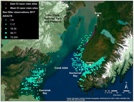 The importance of physical and oceanographic drivers to the small-scale spatial structuring of some intertidal species likely varies with the extent of top-down pressures [82,83]. Possible top-down drivers of Pacific razor clam abundance include human harvest and predation by animals such as brown bears [21,84] and sea otters [22]. Human overharvest has not been implicated in the decline of razor clams in ECI, primarily due to relatively low harvest rates [9] and lack of recovery after several years of fishery restrictions and subsequent closure [3]. Previous studies along the Katmai National Park and Preserve coast, just south of LACL, have observed bears consuming intertidal resources, but the level of predation is not thought to be sufficient to impact bivalves at the population level [84]. Bear predation is not thought to be a factor driving clam abundance at ECI, as bears are rarely seen on ECI beaches. In contrast, sea otters are widely recognized for their role in structuring nearshore marine ecosystems [85,86,87,88,89,90]. The sea otter is a keystone predator [85] whose historical range encompassed the entire coastal north Pacific before they were almost extirpated, except for small remnant populations, due to the maritime fur harvest [91]. International protections beginning in 1911 have allowed sea otters to reoccupy habitats [92] where invertebrate populations flourished in their absence. Through predation, a decrease in the abundance of select marine invertebrates is often an outcome of sea otter recolonization, including species important to both commercial, subsistence, and recreational fisheries [93,94,95,96,97,98]. The sea otters’ diet is dominated by a variety of clam species throughout the Gulf of Alaska [59,88,99,100]. Studies conducted in Washington, where sea otters have recently expanded into areas with high densities of Pacific razor clams, report sea otter diets consisting largely of razor clams [22]. The decline of razor clams in ECI may result from the expansion of the sea otter population moving north from Kachemak Bay along ECI (Figure 4). Aerial surveys conducted in 2002 estimated the abundance of sea otters in ECI (excluding Kachemak Bay) to be approximately 962 animals [101]. By 2017, the ECI abundance estimate for sea otters (excluding Kachemak Bay) was 3164 animals [23], a 230% increase. Estimates for the WCI area have also increased during the same time frame (6918 sea otters in 2002; 10,737 in 2017; a 55% increase; [101]); however, in 2017, sea otters had not expanded their range north of Kamishak Bay ([23]; Figure 4), where expanses of razor clam beaches and harvests persist. While not directly measured in this study, the distribution and abundance of sea otters are different between the two sides of Cook Inlet [23] and are potentially drivers in the population status of razor clams that deserve further investigation.