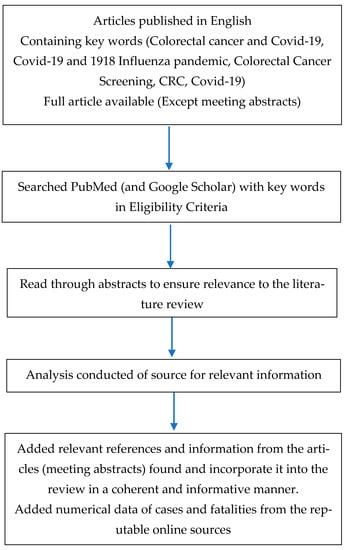 In order to conduct the literature review, we first described our topic and created an outline to better specify the types of sources and the content of information we would cite and reference in the literature review. We conducted searches in PubMed and Google Scholar databases using search terms including, but not limited to, “colorectal cancer COVID-19,” “colon cancer screening COVID-19,” “COVID-19 and 1918 influenza pandemic” and “colorectal cancer and Spanish flu.” We also used these and other search terms, as needed, in Google searches. With Google searches, we focused on finding additional information from websites of organizations, government agencies, or other reputable sources including meeting abstracts. Below is a flowchart summarizing the methods for retrieving and selecting scientific articles from the PubMed database (Figure 1).