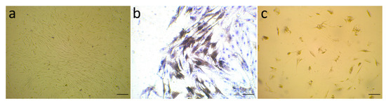The isolated stromal cells from primary breast tissues are a combination of different cell types, the main kind of which is the fibroblast cell line. The stromal fibroblasts from six human breast cancer tissues were isolated and cultured for 14 days and then stained to determine the expression of α-SMA, as a marker of activated myofibroblasts, on them. The purity of CAFs was verified by cell morphology (under a Leica microscope (Wetzlar, Germany) equipped with a Leica camera (DFC450)) and immunocytochemistry. Figure 1a represents the typical morphology of CAFs, Figure 1b shows the activated myofibroblast marker α-SMA expressed on isolated CAFs, and Figure 1c exhibits normal fibroblasts as a control. The α-SMA-positive cells in the cytoplasm are shown in brown color, and CAFs strongly expressed α-SMA.
