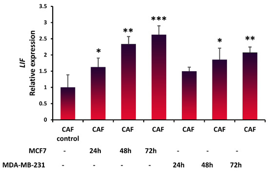 To study whether breast cancer cells stimulate CAFs to produce LIF, LIF expression was evaluated in CAFs after coculturing with breast cancer cell lines by performing qRT-PCR analysis. MCF7 significantly increased the expression of LIF in the CAFs (p < 0.05) after 24 h (Figure 2); however, the amount of LIF expression was not statistically significant in CAFs cocultured with MDA-MB-231 (p < 0.419) after 24 h. However, after 48 h and 72 h, MCF7 and MDA-MB-231 increased LIF expression significantly, and this elevated expression was associated with time. Both cell lines, particularly MCF-7, significantly increased LIF expression in CAFs. Our in vitro study revealed that breast cancer cells stimulated CAFs to secrete LIF, which is in agreement with another study [32].
