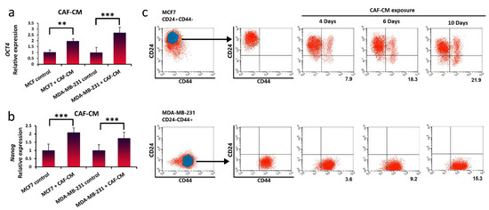 Breast cancer cells can be dedifferentiated and regain stem-cell-like properties through treatment with CAF-CM. (a,b) qRT-PCR analysis was used to measure Nanog and Oct4 gene expression as cancer stem cell biomarkers in MDA-MB-231 and MCF7 cells cultured with or without CAF-CM after 10 days. Representative graphs of 3 independent experiments using the same CAF-CM are shown. The data show the mean ± S.D. and were analyzed using the Student’s t-test; ** p < 0.01 and *** p < 0.001. (c) Breast stem cell markers (CD24−/CD44+) were analyzed by flow cytometry in MCF7 (CD24+/CD44−) and MDA-MB-231 (CD24−/CD44+) cell lines after 4, 6, and 10 days. (Percentage of positive CD24−/CD44+ population is shown in numbers for MCF7, and the mean fluorescence intensity (MFI) is shown in numbers for MDA-MB-231).