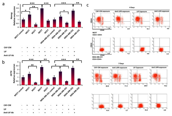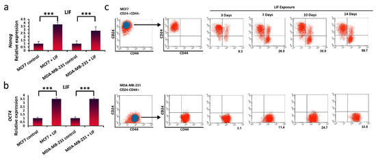 LIF exposure can dedifferentiate breast cancer cells and promote the acquisition of stem-cell-like properties. (a,b) qRT-PCR analysis was used to measure breast cancer stem cells gene expression (Nanog and Oct4) in MCF7 and MDA-MB-231 cells exposure to LIF after 14 days. Representative graphs of 3 independent experiments using the same CAF-CM are shown. The data show the mean ± S.D. and were analyzed using one-way ANOVA and the Student’s t-test; *** p < 0.001. (c) Breast stem cell markers (CD24−/CD44+) were analyzed by flow cytometry in MCF7 (CD24+/CD44−) and MDA-MB-231 (CD24−/CD44+) cell lines after 3, 7, 10, and 14 days. (Percentage of positive CD24−/CD44+ population is shown in numbers for MCF7, and the mean fluorescence intensity (MFI) is shown in numbers for MDA-MB-231).