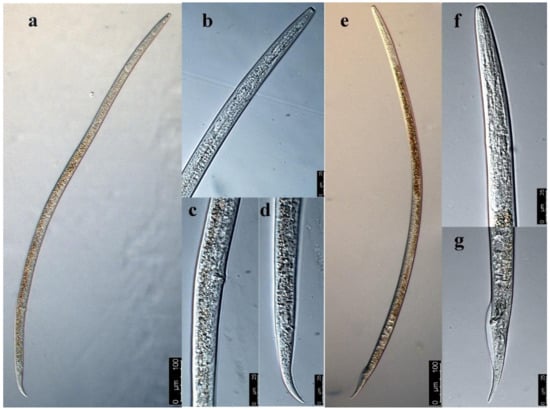 The male body was slenderer than the female body, and the anterior morphology was similar to that of the female (Figure 2e,f). The single testis extended forward, and the front end reached esophagus gland base. The spicule was ventrally curved, and its base was enlarged. The gubernaculum was short and did not extend beyond the cloaca. The wide bursa extended to near the middle of the tail (Figure 2g).