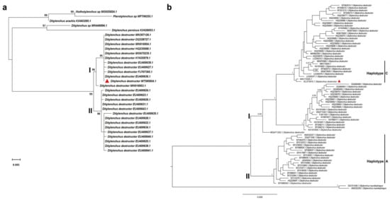 The PCR amplification of the D2/D3 fragments of the 28S rRNA and the ITS-rRNA region for nematodes infecting maize plants yielded two DNA fragments of approximately 780 bp and 1130 bp, respectively. The nucleotide sequences obtained in this study were deposited into the GenBank database (accession no. MT585824 and OL373915). A BLAST search of the nucleotide sequence of the D2/D3 was conducted and showed a similarity of 98.8–100% with multiple sequences of D. destructor populations available in the GenBank database. Among them, the top three sequences with highest identity (100%) are EU400636 (Query Cover = 100%, E value = 0.0), MG675235 (Query Cover = 99%, E value = 0.0), and KY435979 (Query Cover = 99%, E value = 0.0), which are three D. destructor isolates from China. The phylogenetic analysis based on the maximum likelihood method further revealed that the D. destructor population obtained from maize and other isolates of D. destructor infesting carrot, sweet potato, and potato from China and other countries are in one clade supported by a 99% bootstrap value (Figure 3a). The ITS-rRNA region of D. destructor from maize contained an 845 bp full length of ITS1-5.8S-ITS2 region and had 99.4–100% identity with five known sequences of D. destructor (MK979365.1, MZ345883.1, MN173004, MN173005, EF208210, and KF221213) infecting other plants. Bayesian analysis of the ITS1-5.8S-ITS2 rRNA gene sequences of D. destructor populations generated a phylogenetic tree with two main clades (Figure 3b). Phylogenetic relationship showed that this D. destructor population from maize and other reported populations [37] was clustered in Clade Ι and belonged to the ITS haplotype C.