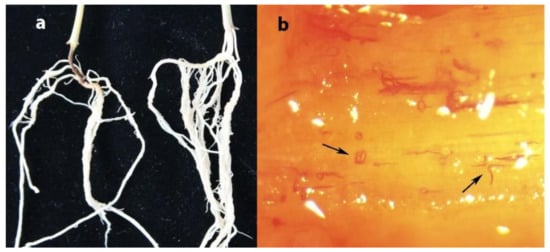 (a) Maize root infected by D. destructor indicated by the arrow, (b) stained Ditylenchus destructor in stem base of maize.