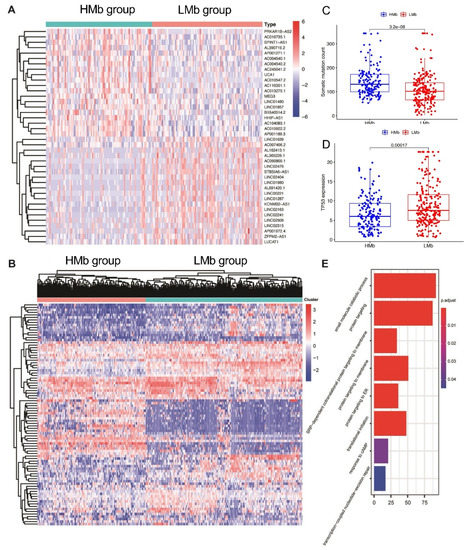 Identification of mutational burden-related lncRNAs in patients with hepatocellular carcinoma. (A) The heat map as an example of the expression of the top 20 identified mutational burden-associated lncRNAs. Differential expression analysis was performed between the patients with accumulative counts of high somatic mutation (the top 25%) (HMb group) and those with accumulative counts of low somatic mutation (the last 25%) (LMbgroup). (B) Unsupervised clustering analysis based on the identified 88 mutational burden-associated lncRNAs. (C) Boxplots of cumulative somatic mutation counts in the HMbgroup and the LMbgroup. (D) The expression of TP53 in the HMbgroup and the LMbgroup. (E) Biological process analyses for the identified lncRNAs correlated mRNAs.