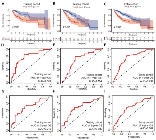 In the training cohort, the low-risk group displayed superior OS compared with the high-risk group, as revealed through the survival analysis (log-rank test, p < 0.001) (Figure 2A). We also validated the prognostic value of the MbLncSig score in the testing and entire cohorts, and a similar change pattern was observed between the groups (log-rank test, p < 0.001; Figure 2B,C). The time-dependent ROC curve analysis in the training, testing, and entire cohorts envisaged the predictive performance of the score for patient prognosis. The area under curves (AUCs) for one-year OS were 0.779, 0.704, and 0.739 in the training, testing, and entire cohorts, respectively (Figure 2D–F). For three-year OS, the respective AUCs were 0.713, 0.693, and 0.689 (Figure 2G–I). These results demonstrate the potential prognostic ability of the MbLncSig score for HCC.