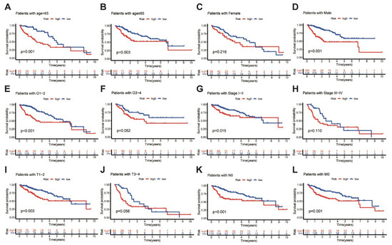 Kaplan-Meier curves analyses of overall survival in high-risk and low-risk groups among the patients with (A) age > 65 years old, (B) age ≤ 65 years old, (C) female, (D) male, (E) grade I-II, (F) grade III-IV (G) AJCC stage I-II, (H) AJCC stage III-IV, (I) T stage I-II, (J) T stage III-IV, (K) N stage 0 and (L) M stage 0, Tumor-Node-Metastasis, TNM.