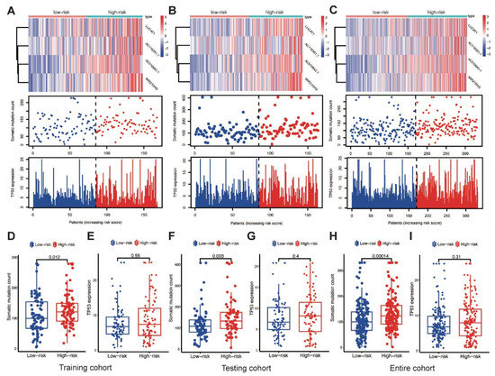 AC010643.1, AC116351.1, LUCAT1 and MIR210HG expression levels; somatic mutation counts; and TP53 expression levels were investigated in the training cohort. Elevated MbLncSig scores indicated the upregulation of those lncRNAs (Figure 4A). The somatic mutation counts were significantly higher in patients with a high score than in patients with a low score (p < 0.001), whereas no statistical difference was observed in TP53 expression levels between the high- and low-risk groups (Figure 4D,E). Expression patterns were also assessed in both the testing and entire cohorts. As shown in the Figure 4B,C, with an increase in the MbLncSig score, similar expression patterns were observed in both cohorts. Similarly, in both the cohorts, the high-risk group displayed a significantly higher number of somatic mutations than the low-risk group. However, no statistical differences were observed in TP53 expression levels between the groups in both cohorts (Figure 4F–I). These results indicated that the performance of MbLncSig score is superior in the training, testing, and entire cohorts.