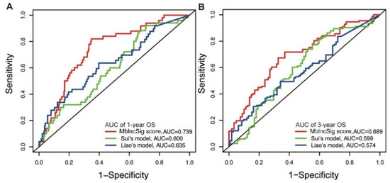 Next, the predictive performance for OS was compared between our model and two published lncRNA signatures. One predictive model, published by Sui’s study (Sui’s model), consisted of four lncRNA-related signatures using the TCGA cohort (LINC00261, TRELM3P, GBP1P1, and CDKN2B-AS1) [19]. Another predictive model, derived from Liao’s study (Liao’s model), included four lncRNA-related signatures (AC025016.1, LINC01164, LINC01183 and LINC01269) using the TCGA cohort [20]. Our results showed that the AUC of one year of our predictive model is 0.739, which is superior to those of Sui’s model (AUC: 0.600) and Liao’s model (AUC: 0.635) (Figure 5A). Similarly, the AUC of the three-year OS of our model is also higher than those of the two published models (AUC: 0.689 vs. 0.599 and 0.574) (Figure 5B). These findings indicated a strong performance of the MbLncSig score in predicting the prognosis of patients with HCC.