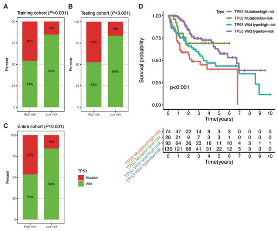 Further, the proportion of TP53 mutations was analysed between the high-risk and low-risk groups. In the training cohort, TP53 mutation was detected in 46% and 15% of patients in the high-risk and low-risk groups, respectively (p < 0.001; Figure 6A). Similarly, a higher percentage of TP53 mutation was observed in the high-risk group than in the low-risk group in the testing (47% vs. 16%, p < 0.001) and entire (47% vs. 16%, p < 0.001; Figure 6B,C) cohorts. The findings indicated that the MbLncSig score is significantly correlated with TP53 mutation.
