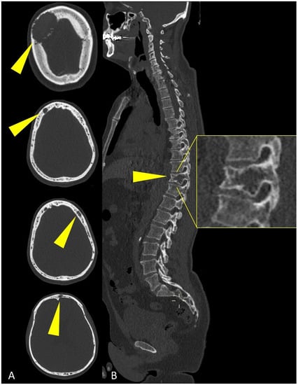 Multiplanar CT images showing (yellow arrowheads) osteolytic lesions of (A) the skull and of (B) a dorsal vertebra (detail in (B)).
