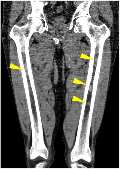 Coronal CT image of (yellow arrowheads) bilateral femoral focal intra-medullary high CT density lesions in a patient with MM.