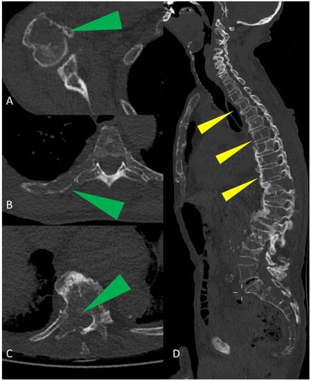 Multiplanar CT images showing humeral, ribs, and vertebral osteolytic lesions (green arrowheads in (A–C)); multiple osteolytic lesions of the spine (yellow arrowheads in (D)).