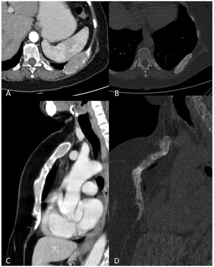 Axial images using a “bone” reconstruction algorithm must be systematically performed, usually in a cranio-caudal fashion, starting from the skull to the cervical, thoracic, and lumbar spine, pelvic bones, and lower limbs, whereas ribs, sternum, scapulae, clavicles, and upper limbs are evaluated afterward (Figure 1B). Once completed, it is advisable to analyze the sagittal multiplanar reconstruction (MPR) images of the spine to identify vertebral fractures and to assess the risk of neural compression (Figure 1C). MPR images are also useful to differentiate benign osteoporotic vertebral fractures from malignant ones (although MRI remains the gold standard for differential diagnosis of vertebral collapse): predictive CT findings of benign vertebral fractures are the presence of fracture lines within vertebral body, retropulsion of a bone fragment from posterior wall into the spine canal, evidence of paraspinal soft tissue widening, and intravertebral “vacuum sign” defined as the presence of an air cleft in the vertebral body. Features associated with malignant vertebral fracture are the presence of extended destruction of the vertebral body (cortex and cancellous bone) and pedicles, as well as a focal soft tissue mass in the paravertebral or epidural space [15]. Focal and/or diffuse intra-medullary infiltration of femur and humerus can be found by analyzing axial and MPR images (Figure 2 and Figure 4) [22].