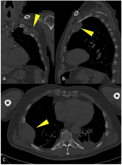 Multiplanar CT images showing a large para-medullary lesion (yellow arrowheads in (A–C)): extra-osseous pathologic tissue in the chest wall soft tissues originating linked to skeletal involvement of the rib.