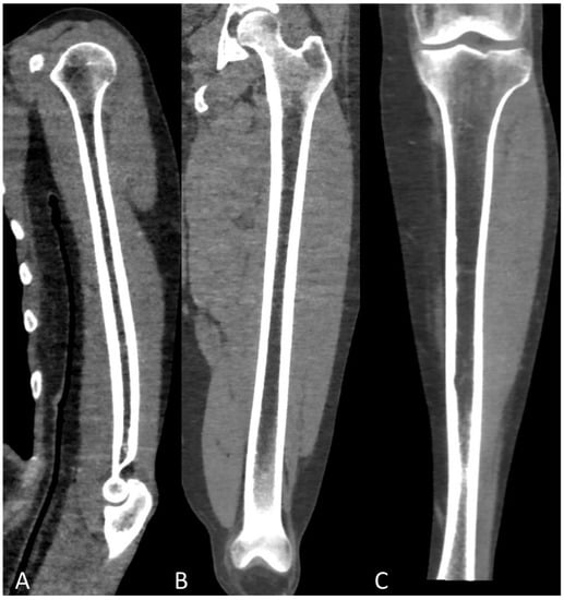 Multiplanar CT images with “soft tissue” window showing the distinctive aspect of normal (A) humeral, (B) femoral, and (C) tibial fatty bone marrow on low-dose CT in healthy adults.