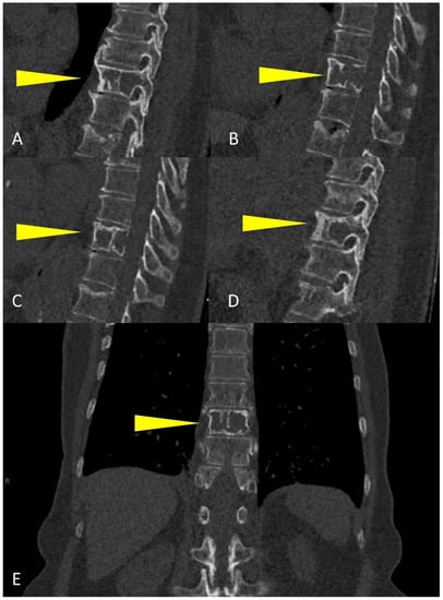Sagittal CT reconstruction from right to left (A–D), and (E) coronal multiplanar reconstruction of a dorsal vertebra showing a large osteolytic lesion involving more than 50% of the vertebral body (yellow arrowheads), with high risk of fracture.