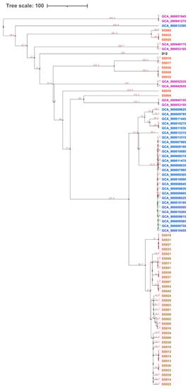 For the purpose of comparison, 37 additionally available serotype 9 genomes were obtained from public databases and used in this study, including 28 isolates from the Netherland, eight isolates from the U.K., and D12 from China. By BlastP and cluster analysis, 205 single-copy orthologous genes were obtained and aligned by MUSCLE. Subsequently, a phylogenetic tree was constructed in MEGA (1000 bootstrap replications) [].