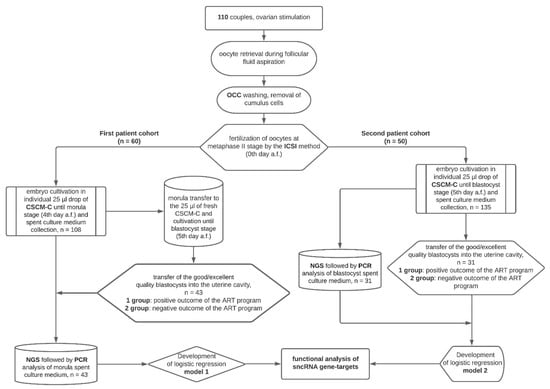 The research consisted of three main stages: (1) embryological stage, with the formation of embryo groups at morula and blastocyst development stages with different implantation potential; (2) quantitative analysis of sncRNA in morula groups by deep sequencing and qPCR in spent culture medium to develop logistic regression models (1—for the morula, 2—for the blastocyst) to prognose implantation potential; (3) functional analysis of target genes of sncRNAs associated with implantation potential at different development stages—morula and blastocyst (Figure 1).
