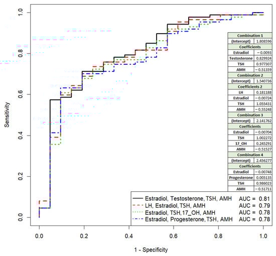 Receiver operating characteristic (ROC) curves of the logistic regression models to predict pregnancy based on hormonal data for all women included in the study. TSH—thyroid-stimulating hormone, AMH—anti-müllerian hormone, 17_OH—17-OH-progesterone.