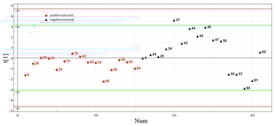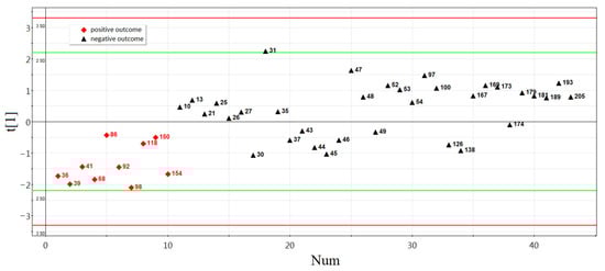 According to the Partial Least Squares Discriminant Analysis (PLS-DA) model based on RT-PCR data without outlier samples, two clusters of data points can be clearly distinguished (Figure 8). The first one (highlighted in red) has an abscissa of less than 0.1 and represents the samples of spent culture medium from good/excellent blastocysts, implanted with the development of normal pregnancy after their transfer to the uterine cavity. The second cluster (highlighted in black) has an abscissa of more than 0.1 and represents the samples of spent culture medium from good/excellent blastocysts with no implantation.