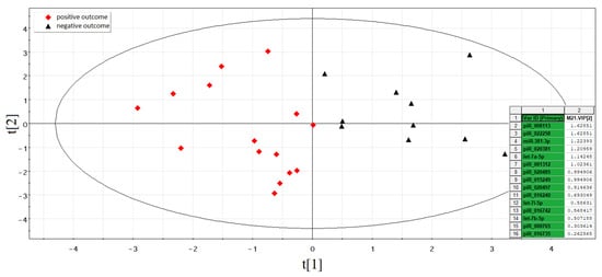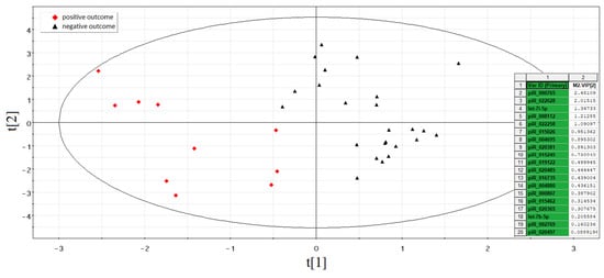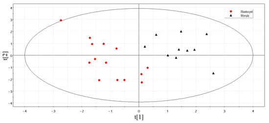 According to the Partial Least Squares Discriminant Analysis (PLS-DA) model based on RT-PCR data without outlier samples, two clusters of data points can be clearly distinguished (Figure 4). The first one (highlighted in red) has an abscissa of less than −0.4 and represents the samples of spent culture medium from the morula developed into good/excellent blastocysts and resulting in normal pregnancy after their transfer to the uterine cavity. The second cluster (highlighted in black) has an abscissa of more than −0.4 and represents the samples of spent culture medium from the morula developed into good/excellent blastocysts with no implantation.