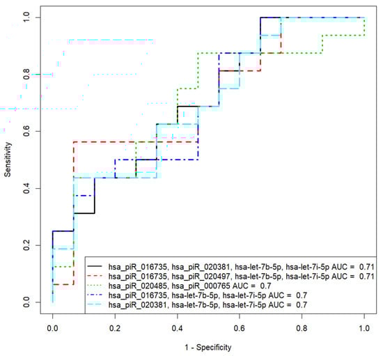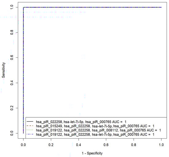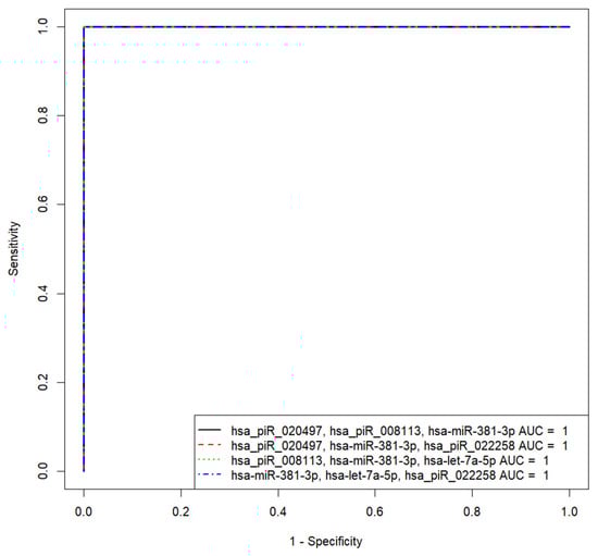 We found that the diagnostic accuracy of expression profiling of any combination of sncRNAs was 100% (AUC = 1, sensitivity—100%, specificity—100%, true positive rate—1; false positive rate—0).
