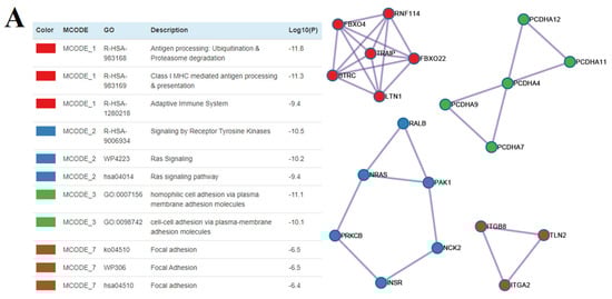 Figure 11 clearly shows that among the proteins physically interacting with each other, there are those involved in the processes of ubiquitination and proteasome degradation at both the morula (MCODE_1, Figure 11A) and blastocyst stages (MCODE_2, Figure 11B), with a more numerous groups of these proteins in the latter. These proteins play a key role in the elimination of maternal factors after fertilization during the maternal-to-zygotic transition (MZT) and subsequent zygotic genome activation (ZGA) [35]. Another major eukaryotic protein degradation system in the embryo during preimplantation development is autophagy [36], and as it follows from Figure 11B (MCODE_1), 13 proteins with these functions physically interact and form a network at the blastocyst stage. While comparing Figure 11A,B, it is conspicuous that the proteins involved in cell adhesion (MCODE_3 and MCODE_7, Figure 11A) predominate at the morula stage, whereas most of the physically interacting protein networks at the blastocyst stage are involved in mRNA processing (MCODE_6, Figure 11B) and separation of sister chromatids during mitosis (MCODE_5, Figure 11B). Of note is the different protein composition of the networks involved in signaling through the receptor tyrosine kinases implicated in the regulation of a variety of biological responses, such as cell proliferation, migration, differentiation, and survival, at the morula (MCODE_2, Figure 11A) and blastocyst stage (MCODE_4, Figure 11B).