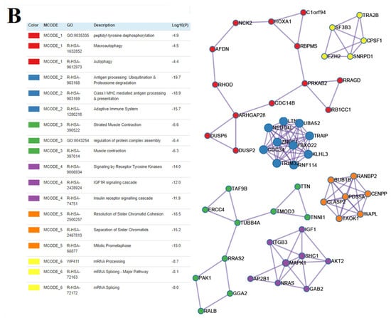 Network of proteins that form physical interactions with each other for morula (A) and blastocyst (B) stages while applying the Molecular Complex Detection (MCODE) algorithm. The full name of the proteins can be found in the NCBI database (https://www.ncbi.nlm.nih.gov/gene, last accessed on 15 June 2021) according to the RefSeq mRNA accession number indicated in Table S2 (Sheet 2).
