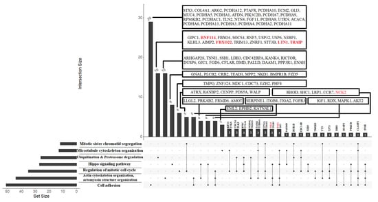 It is important to note that the protein products of several analyzed target genes are polyfunctional, i.e., they participate in more than one biological process indicated in Figure 12. Among them, CLIP-associated protein 2 (CLASP2) plays an essential role in epiblast cell differentiation into mesoderm and endoderm lineages during gastrulation [40]. Another protein from this group is PRKCB—protein kinase C, beta—which is involved in the regulation of mitochondrial integrity and oxidative phosphorylation [41]. Titin (TTN), a connectin, is megadalton-sized filamentous molecule that promotes human trophoblast invasiveness via the activation of the MAPK pathway, providing proper placentation and embryo development [42]. NRAS belongs to the family of Ras proteins, which control cell proliferation pathways, cell growth, and division [43]. Tropomodulin-3 (Tmod3) negatively regulates cell motility by controlling actin polymerization and stability, and in the case of Tmod3 knockdown, the gradual increase in the level of cytoplasmic actin and spindle migration are impaired during oocyte maturation [44]. CDC14B, a dual specificity phosphatase that counteracts cyclin-dependent kinase 1 (CDK1/CDC2A) action, is found to be a negative regulator of the 1-to-2-cell transition and of zygotic genome activation in mouse embryogenesis [45]. BUB1B (BUB1 mitotic checkpoint serine/threonine kinase B) has been reported to be associated with developmental potential of the human pre-implantation zygote [46]. The β3 integrin subunit (ITGB3) is implicated in the adhesion cascade for implantation, and being part of the integrin adhesion complexes such as ITGAV:ITGB3/SPP1 during implantation in humans, participates in the numerous intracellular pathways to regulate cell growth, proliferation, survival, gene expression, development, migration, and invasion [47,48]. Moreover, ITGAV:ITGB3 integrins define the window of implantation in women [49]. PAK1, a member of the p21-activated kinase (PAK) family of nonreceptor serine/threonine kinases, is involved in the assembly and disassembly of focal adhesions and stress fibers through myosin light-chain kinase phosphorylation; it plays important role in the Wnt-signaling pathway, phosphorylating β-catenin, followed by its nuclear translocation and activation of signal transduction cascades important in proliferation, morphogenesis, and differentiation. It can increase cell migration through activation of Paxillin and the MAPK/JNK pathway and can directly phosphorylate Snail to repress genes important for cell adherence and cell polarization [50]. It was shown that two other PAK family members, PAK2 and PAK4, play crucial roles in the development of the embryo, as their gene deletion results in embryonic lethality in mice. NCK2 interacts with the PAK family and their upstream activators to regulate cytoskeletal dynamics [51]. Jacquet K. and colleagues found that Nck2−/− cells delay in cytokinesis (the final stage of cell division), display longer intercellular bridges, and often fail to complete abscission [52]. As for TUBB4, it is the crucial element of the microtubules participating in the turnover of focal adhesions, which regulate cell polarization and migration, and is responsible for efficient transport of N-cadherin to the cell membrane [53]. Depletion of VPS4, AAA ATPase, alters centrosome numbers and size and causes defects in polar spindle formation and chromosome segregation during cell division [54]. Finally, it is important to note the regulator of Hippo-signaling pathway TAOK1/3, identified as direct kinases for LATS1/2 [55], which in turn acts together with phosphorylated Amot to enhance the phosphorylation and nuclear exclusion of Yap1, allows the expression of pluripotency-associated genes in the inner cells of the 16-cell embryo [37].