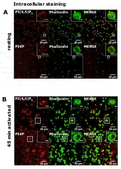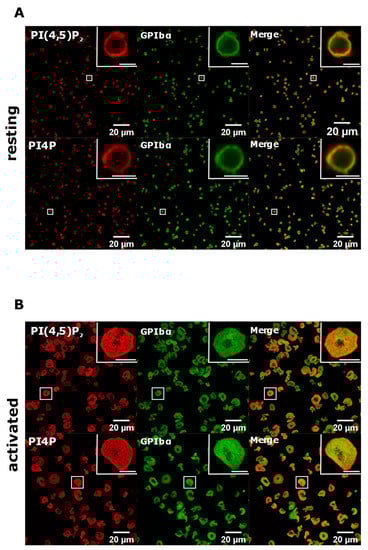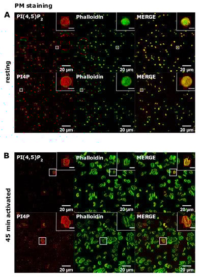 Finally, we conclude that, in addition to many differences in the role, structure, and function of resting and activated PLTs, there is also a difference in the composition and distribution of PI(4,5)P2 and PI4P in the PM that results in the more difficult detection of these lipids in activated than in resting PLTs. Nevertheless, by modulating permeabilization time and the amount of permeabilizing agent, we were able to optimize and reveal the localization of these two lipids.