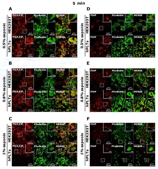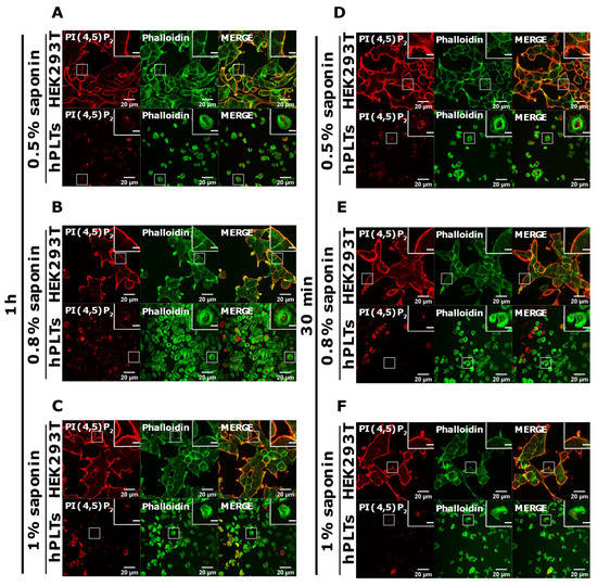 Modulation of the PM staining of PI(4,5)P2 and PI4P with 5 min of permeabilization and different saponin concentrations. HEK293T cells were fixed 24 h after seeding and were stained for the PM pool of PI(4,5)P2 and PI4P, and co-stained for actin. PLTs were isolated from human peripheral blood, spread on glass for 45 min, fixed, stained for the PM pools of PI(4,5)P2 and PI4P, co-stained for actin, and imaged with a confocal microscope. (A–F) HEK293T cells and human PLTs were permeabilized for 5 min with (A,D) 0.5% saponin, (B,E) 0.8% saponin, and (C,F) 1% saponin and stained for (A–C) PI(4,5)P2 or (D–F) PI4P. Representative images display a single confocal optical section. The scale bar of the images is 20 μm, while the scale bar of the inserts is 5 μm.