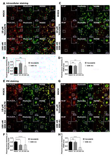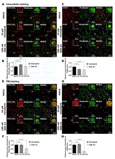 The intracellular and PM localization of PI(4,5)P2 and PI4P, visualized with the optimized protocol, in activated PLTs and their modulation by OCRL and PI4KIIIα inhibitors. PLTs were isolated from human peripheral blood, fixed, stained for the (A–D) intracellular or (E-H) PM pools of PI(4,5)P2 and PI4P, co-stained for actin, and imaged with a confocal microscope. The dephosphorylation of PI(4,5)P2 was inhibited by 10 µM of OCRL inhibitor YU142670, and the production of PI4P was inhibited by 100 nM of PI4KIIIα inhibitor GSK-A1. Representative images display a single confocal optical section. The scale bar of the images is 20 μm, while the scale bar of the inserts is 5 μm. (B,D,F,H) Images were analyzed with Fiji ImageJ software to measure the mean fluorescence intensity of PI(4,5)P2 and PI4P. The graphs show the mean fluorescence intensity of PI4P and PI(4,5)P2. Results in the graphs are presented as means, and error bars denote ± SEM from 3 independent experiments. *, p < 0.05; **, p < 0.01; ***, p < 0.001; ****, p < 0.0001; ns, non-significant.