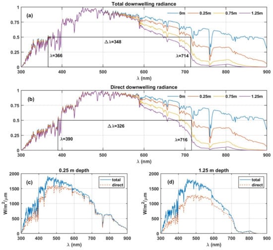 Solar radiation reaching the surface and down to the ocean at 1.25 m depth, including spectra at intermediate depths: 0.25 and 0.75 m. (a) Shows the total (direct + diffuse) downwelling radiance spectra at different ocean depths; (b) shows the direct downwelling radiance spectra at the corresponding levels. The rectangles indicated with wavelengths show the FWHM at 0.25 m ocean depth. (c,d) Show the differences between total and direct downwelling radiance at 0.25 and 1.25 m ocean depths.