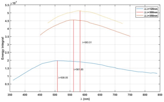 Intensity of radiation energy at each centre wavelength () for 120, 300, and 350 nm vision bandwidth ().