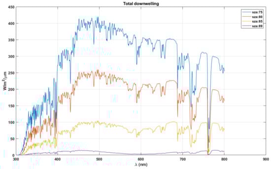 The existing hypothesis states that the optimum information wavelength determines the human scotopic vision [14] to optimise information content for the vision. Therefore, we consider the total downwelling radiation at dusk/dawn to establish the hypothesis on the evolution of scotopic vision. Figure 4 shows that, as the SZA increases from 75° to 89°, after 80°, the radiation at the longer wavelengths (>600 nm) become stronger than at the short wavelengths. Therefore, we choose the downwelling radiation at 80° SZA for analysis to avoid skewing results, considering the peak absorption during scotopic vision occurring around 500 nm.