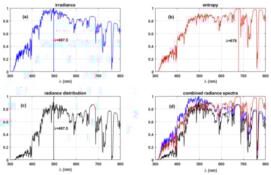 where, and represent the maximum of the entropy and energy spectra. L is the radiance spectra obtained from COART simulations shown in Figure 3a. Figure 3d presents the combined representation of the radiance, entropy, and radiance distribution spectra.