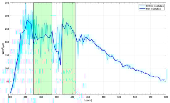 Diffuse radiance reaching the surface of the Earth. A high resolution (0.01 nm) and low-resolution (4 nm) spectra are shown in the graph to highlight distinct regions at 350–380 nm and 400–420 nm.