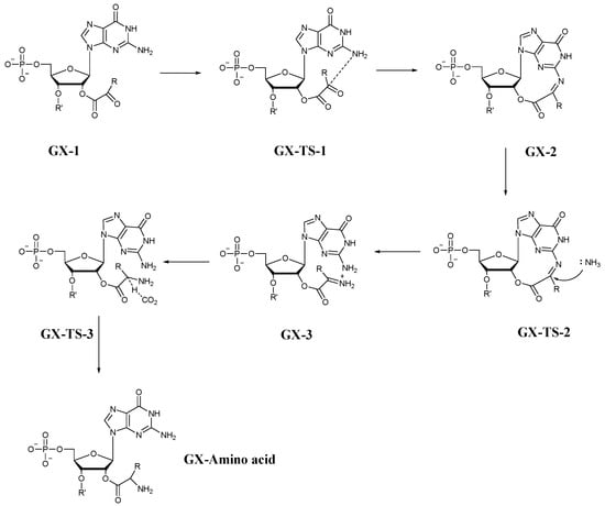 The general outlook for the mechanism of GX cases is as follows and shown in Figure 2: The starting species GX-1 underwent an intramolecular nucleophilic attack on the alpha ketone from the exocyclic amine of the first guanine, which was facilitated by an intramolecular hydrogen bond between the exocyclic amine group of the second guanine and the oxygen (not shown in the figure) of the ketone carbonyl group that was attacked. The transition state for this step was referred to as GX-TS-1. We modelled this transition state with three external water molecules. A set of preliminary calculations in a model transition state without the second nucleotide showed that the model transition state with three water molecules had lower free energy than with one or two water molecules. A similar test was performed, this time using the full system, and showed that using four explicit water molecules led to a TS with higher free energy than when using three such molecules. Eventually, after the transition state, the R-imine is formed, which is shown here as GX-2. The newly formed imine was attacked by ammonia, where the transition state structure of the attack was designated as GX-TS-2. This transition state was modelled in our calculation with the inclusion of one explicit water molecule. Afterwards, the reactive intermediate that was formed, namely, GX-3, reacted with formate where the hydride of the formate was transferred to the carbon of C=+NH2 via GX-TS-3, successfully forming the final amino acid moiety GX-Amino acid and releasing carbon dioxide.